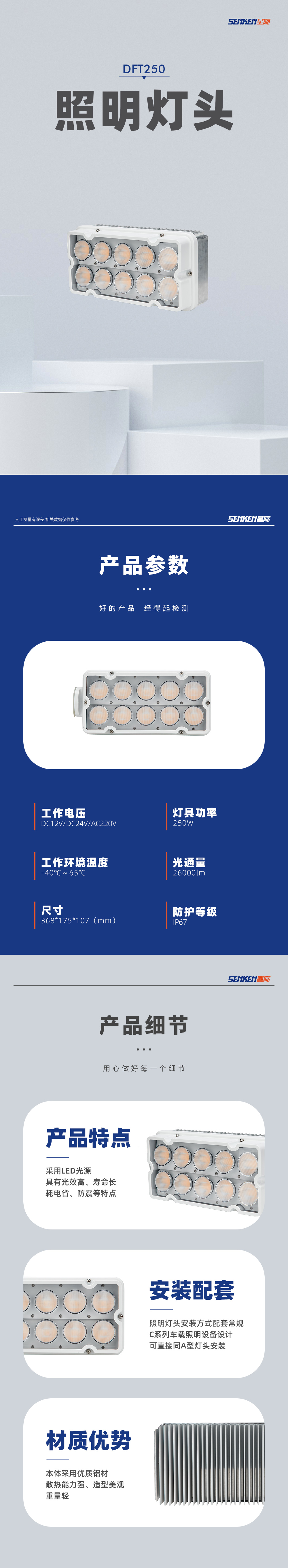 DFT250照明灯头是专业为车载照明设计,适合车载、夜间应急照明使用,采用国际领先的设计理念和制造工艺,选用了国际新LED作为主光源,灯具光学由专业光学团队专利设计,本体采用优质铝材,散热能力强、造型美观、重量轻。
