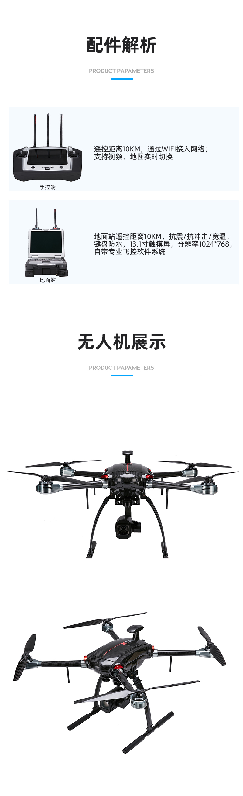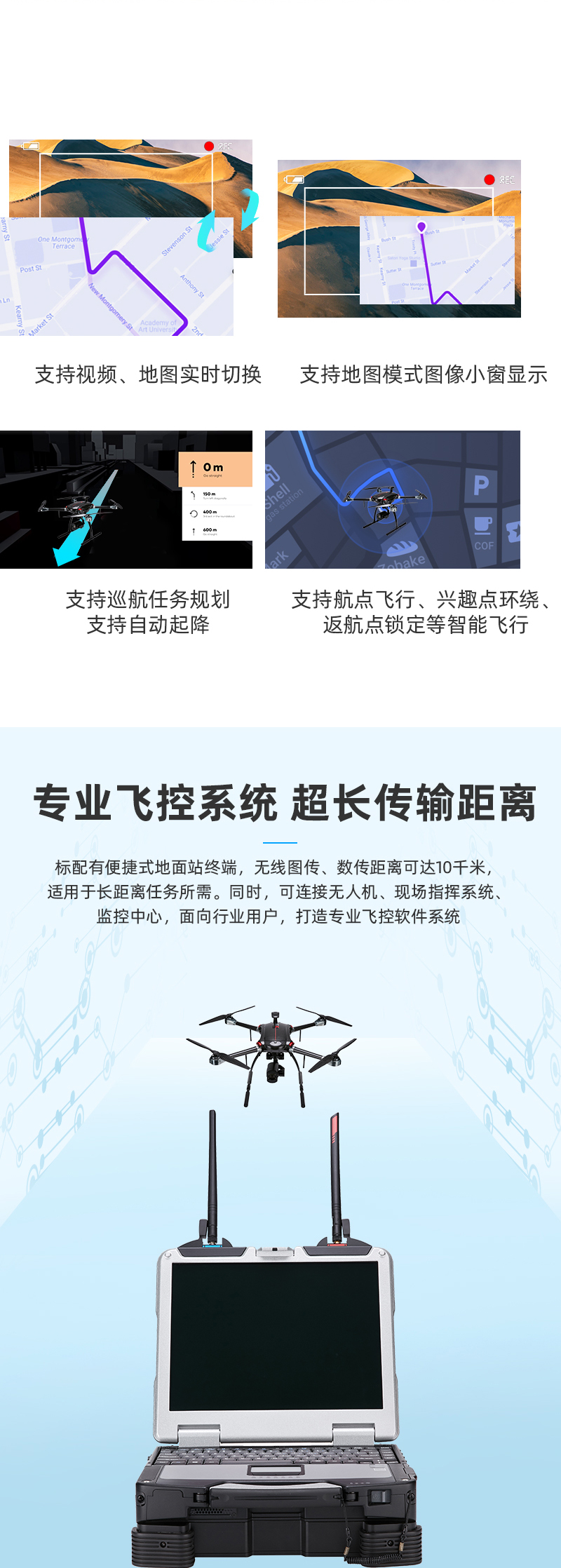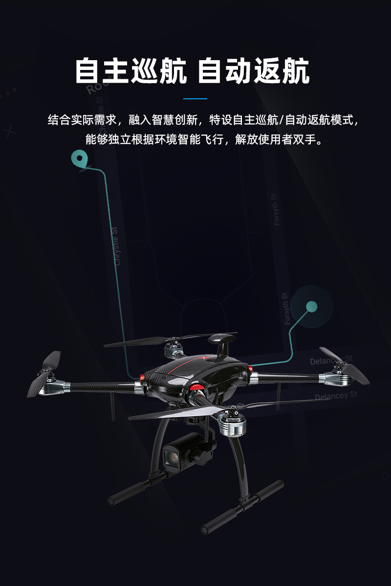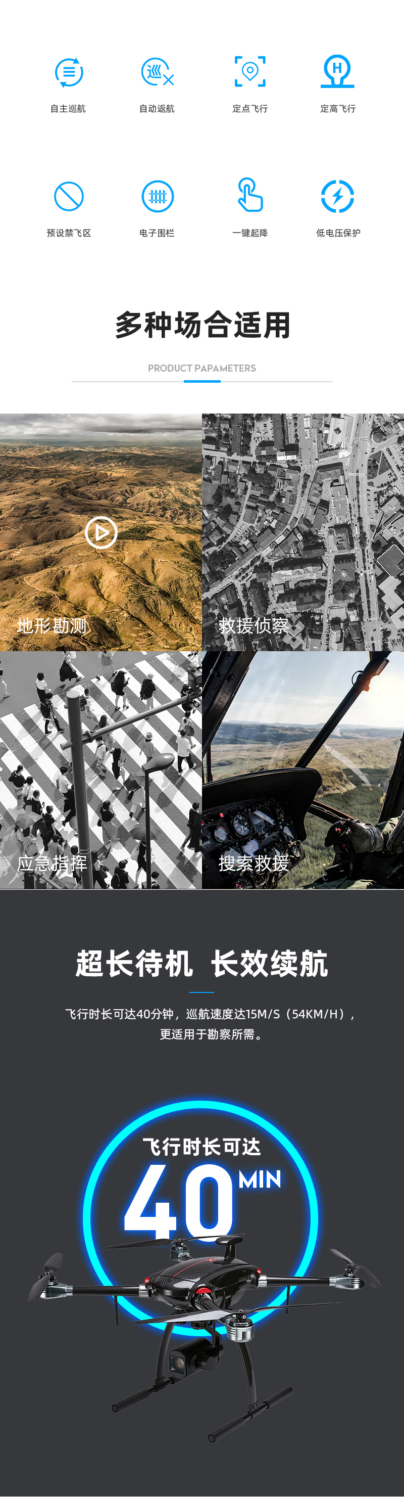 四旋翼无人机采用600W高清摄录,40倍光学变焦,16倍数字变焦,具备定高、定点、自主巡航、自动返航等多姿态飞行模式,标配手持遥控终端与与便携式地面站终端,满足10千米远距离数据传输,实现无人机拍摄画面实时更新同步,以便现场指挥,适用于地形勘测、救援侦查、应急指挥、搜索救援等场景。最大飞行时长可达40分钟,巡航速度达15m/s,一键起降,操控简单。