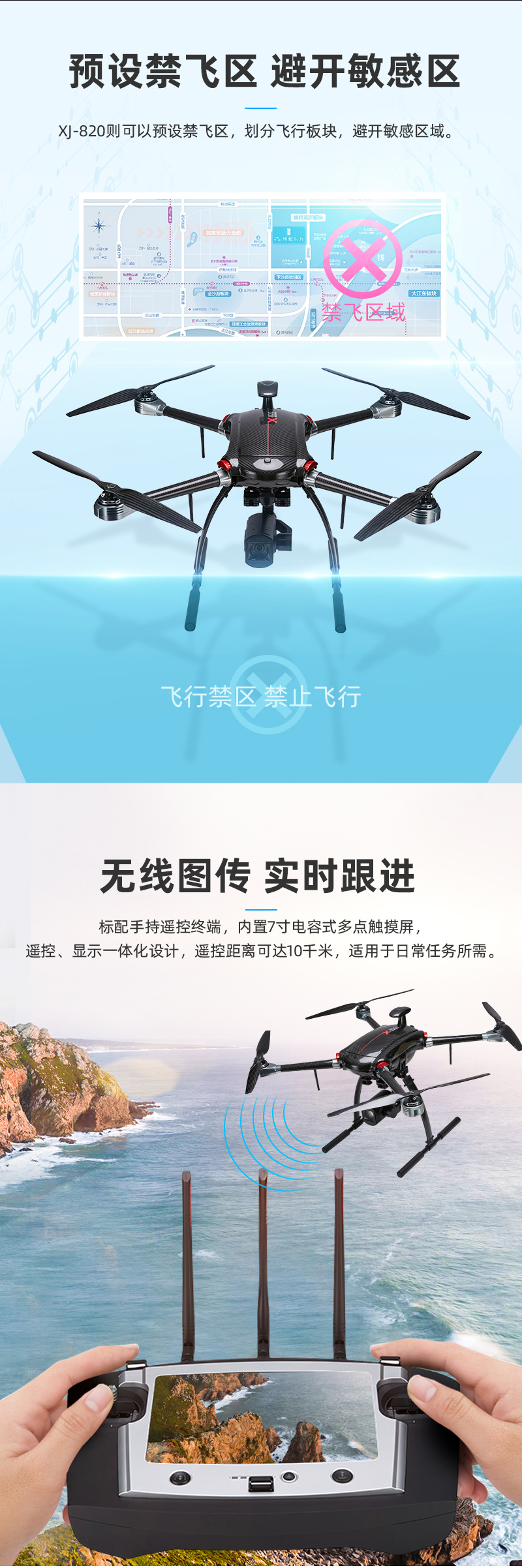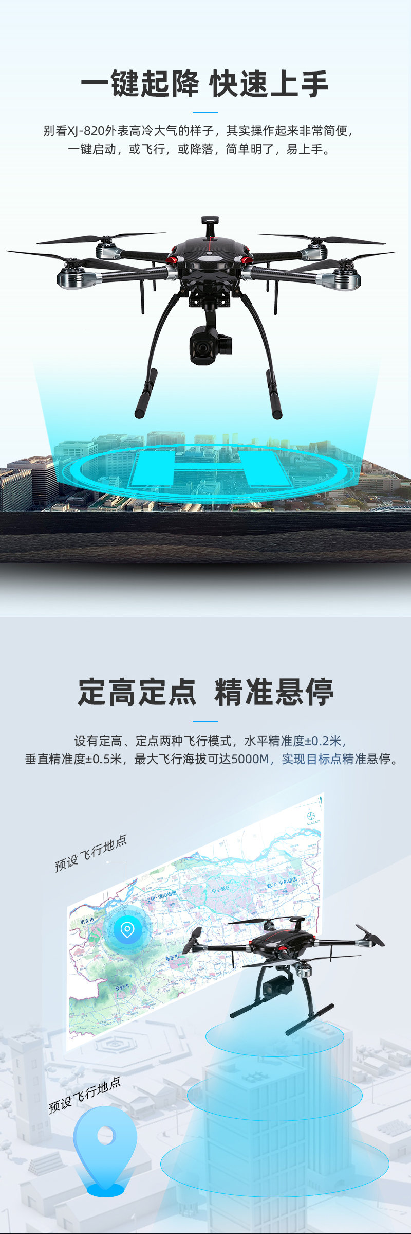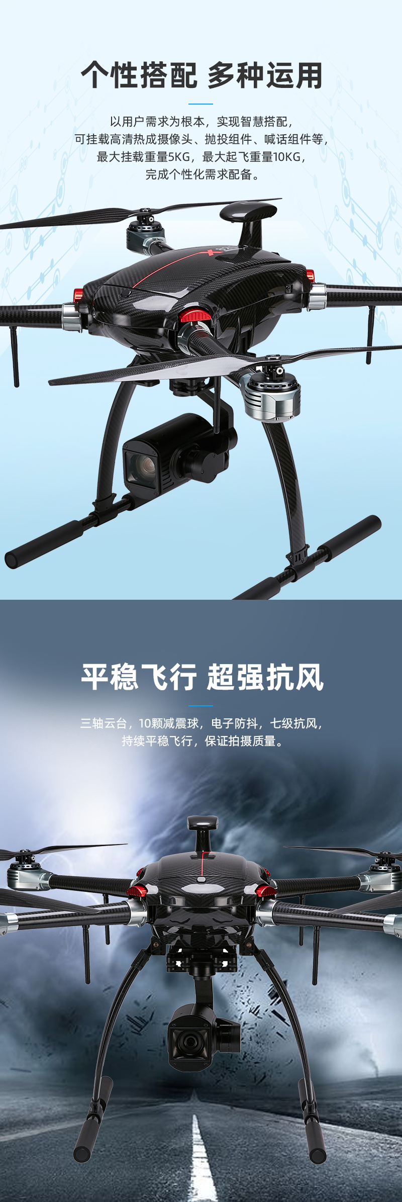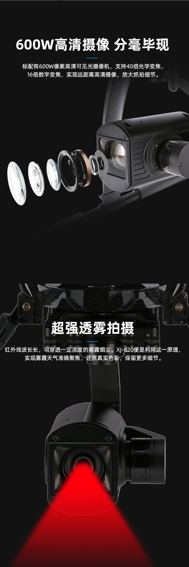 四旋翼无人机采用600W高清摄录,40倍光学变焦,16倍数字变焦,具备定高、定点、自主巡航、自动返航等多姿态飞行模式,标配手持遥控终端与与便携式地面站终端,满足10千米远距离数据传输,实现无人机拍摄画面实时更新同步,以便现场指挥,适用于地形勘测、救援侦查、应急指挥、搜索救援等场景。最大飞行时长可达40分钟,巡航速度达15m/s,一键起降,操控简单。