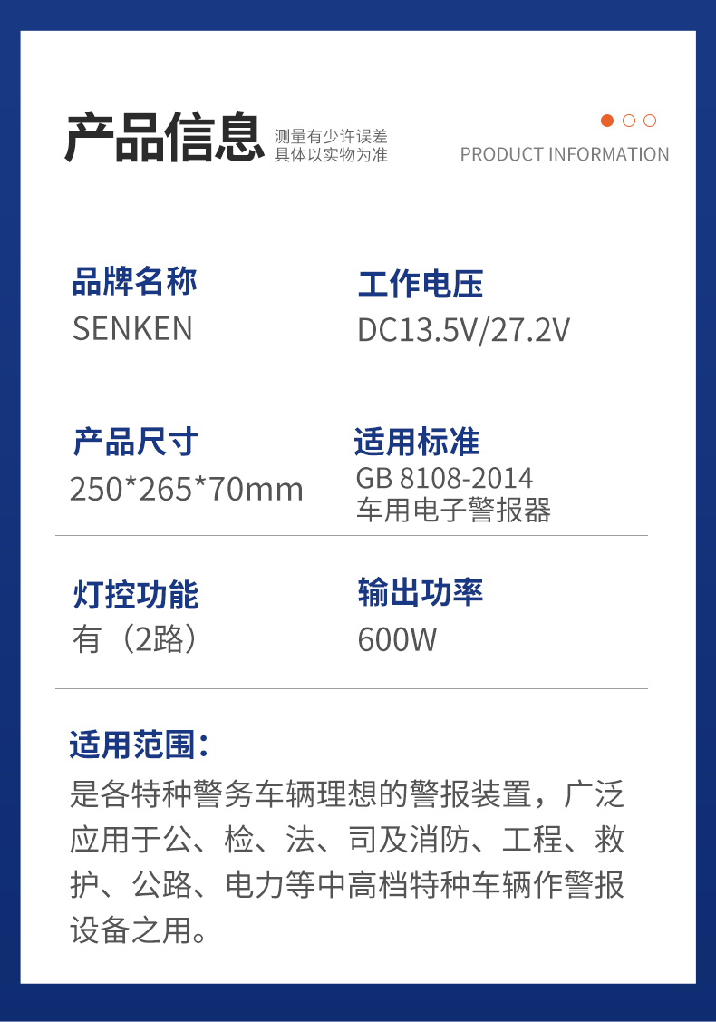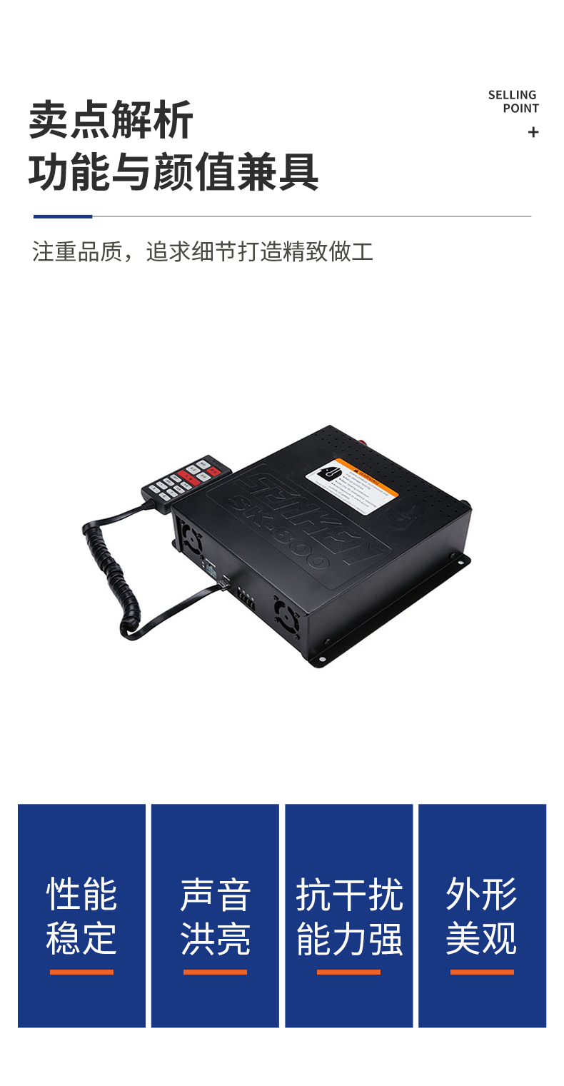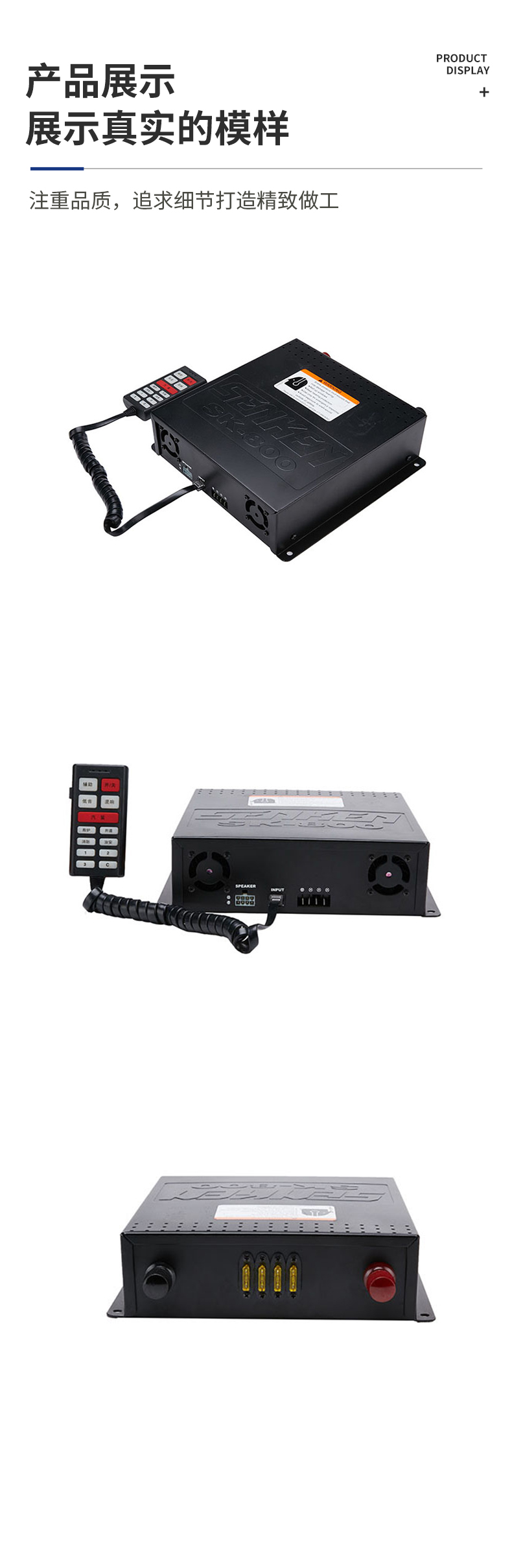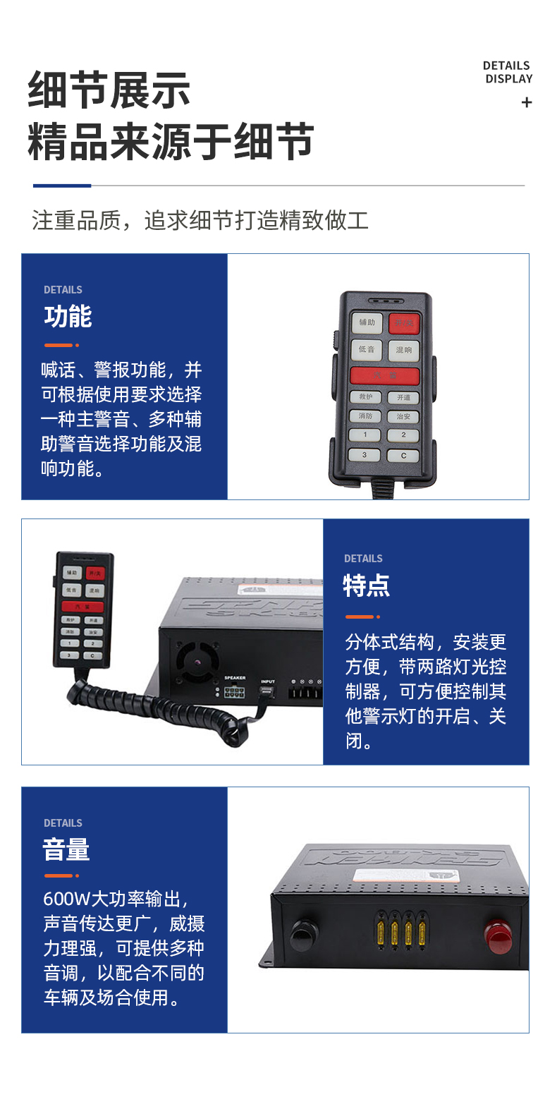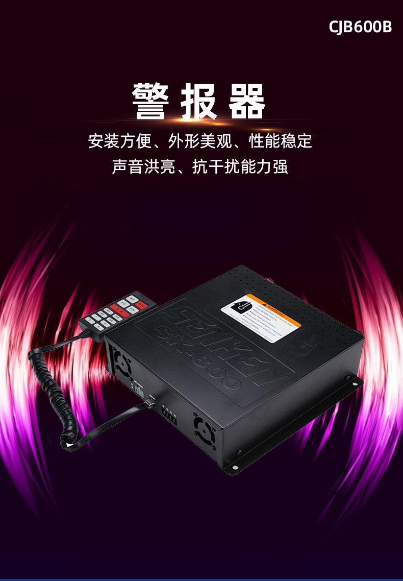 CJB600B警报器是一款分体式结构的车用电子警报器,该产品安装方便、外形美观、性能稳定、声音洪亮、抗干扰能力强, KZQ20控制器按键上带LED背光功能,能让您在夜间操作更加方便。是各特种警务车辆理想的警报装置,广泛应用于公、检、法、司及消防、工程、救护、公路、电力等中高档特种车辆作警报设备之用。