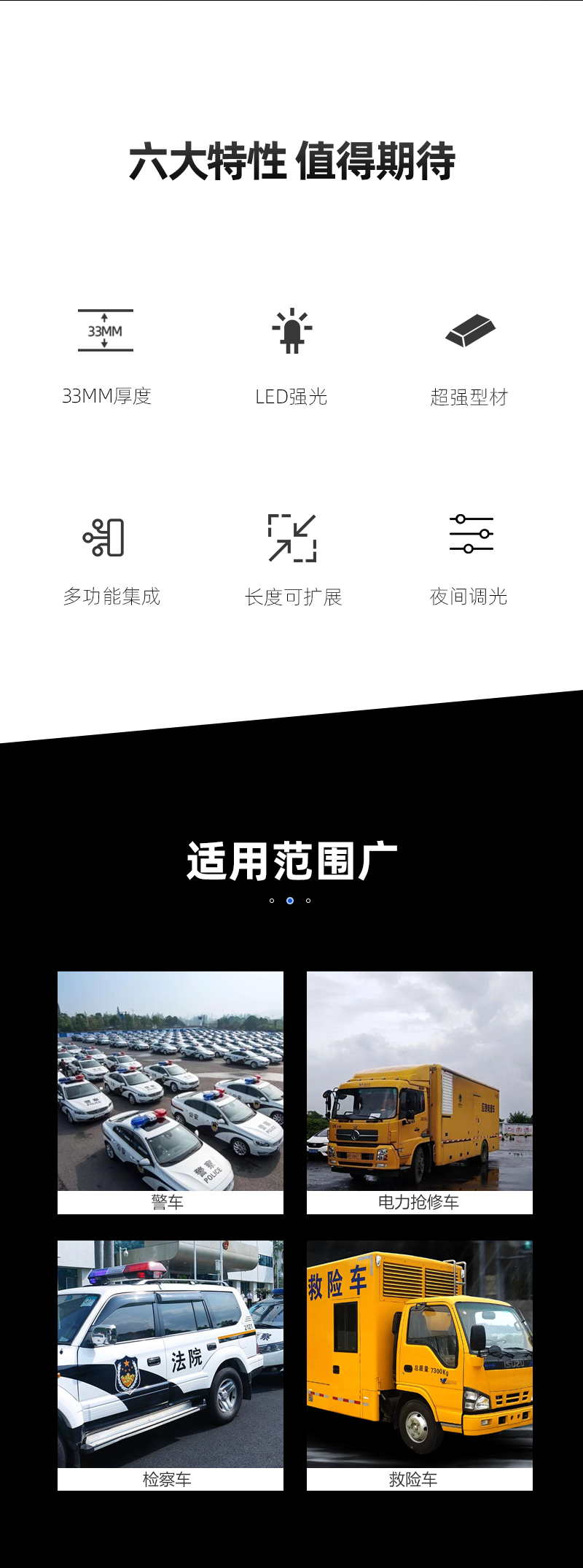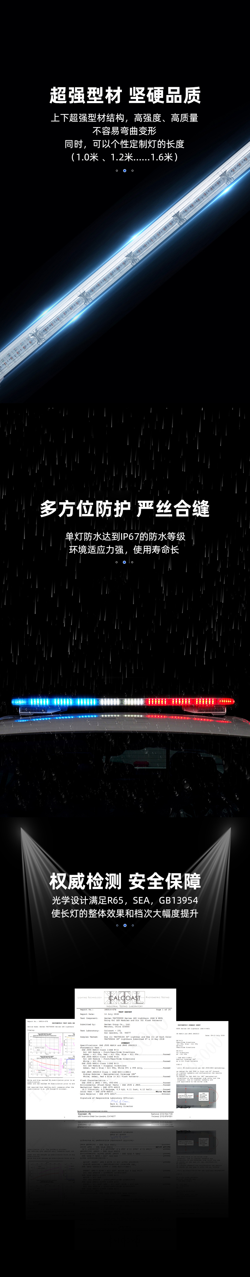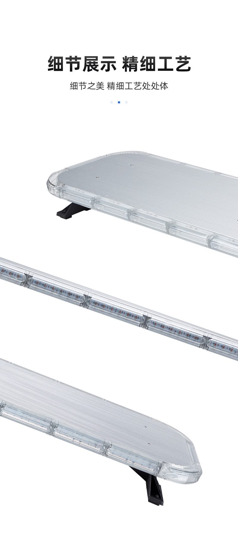 TBD700000系列长排警示灯是我公司自主设计开发的中高端产品,充分考虑运动学和力学的需要,达到与车的完美结合,整体效果充分显示了警车的威严与庄重。 该产品也是采用了节能环保又高效率的高亮度LED做为主光源,及公司高亮度LED灯部件,发挥了强烈的震慑警示效果。该产品的光学设计满足R65,SAE,GB13954,这就使长灯的整体效果和档次大幅度提升,实现成功升级转型。是目前国内中高档警示产品。