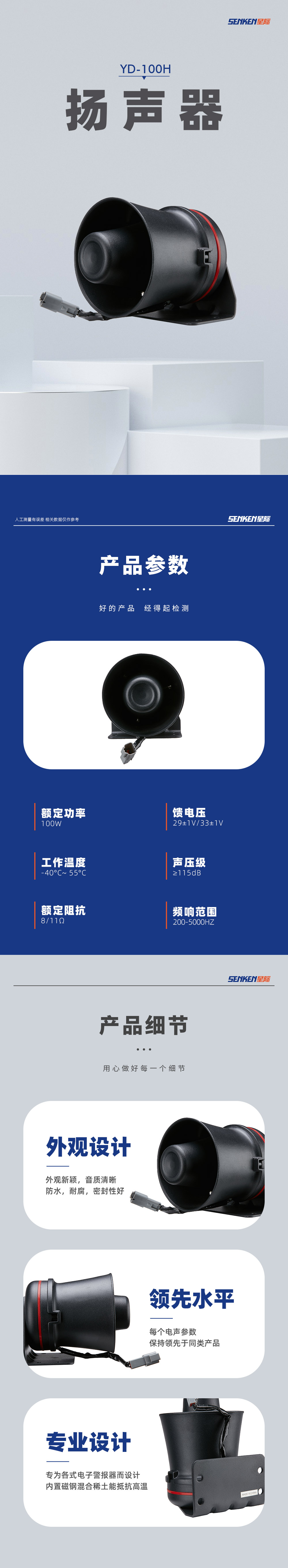 YD-100H扬声器采用国际先进技术,专为各式电子警报器而设计;内置磁钢混合稀土能抵抗高温。外观新颖,音质清晰,防水,耐腐,密封性好。本产品是防水,不锈钢和密封,每个电声参数保持领先于同类产品。
