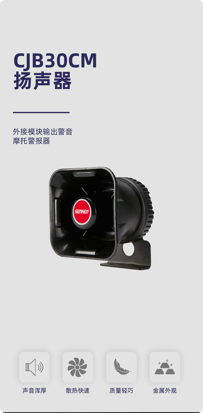 CJB30CM扬声器是我公司根据国际先进技术开发的新产品。它专为各种电⼦警报器、警笛装置设计,具有外形⼩巧紧凑、⾳质清晰、防⽔、耐腐蚀、密封性好等特点,⼴泛⽤于特殊⻋辆和场所,并与警笛配合使⽤。