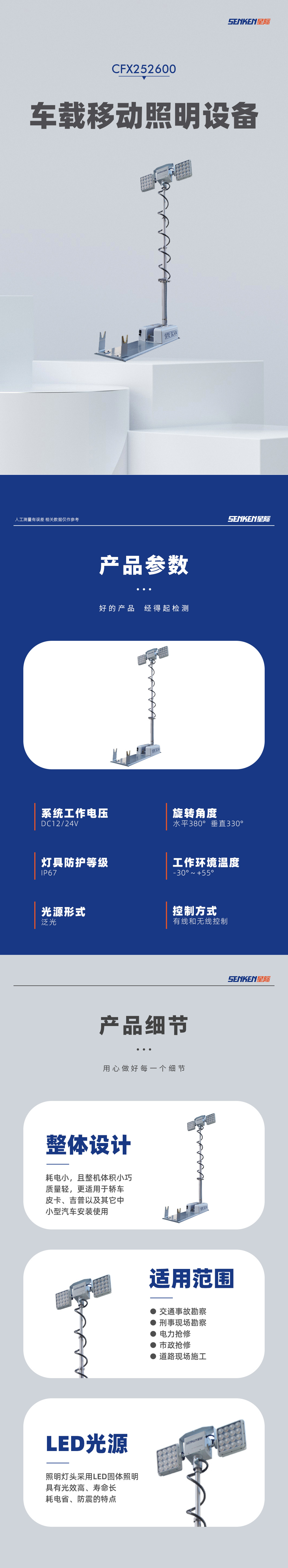CFX252600车载移动照明设备采用高亮度LED作为主要光源,发光高效,使用寿命长,耗电小,且整机体积小巧,质量轻,更适用于轿车、皮卡、吉普以及其它中、小型汽车安装使用。
